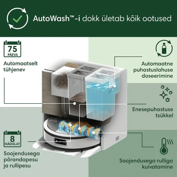 Tänu automaattühjendamisele ning rullipesule saad oma ülesannete nimekirjast veelgi rohkem maha tõmmata, kuna sellel töökindlal dokil on pesurulli kuivatus- ja isepuhastustsüklid.